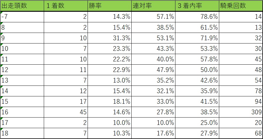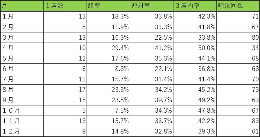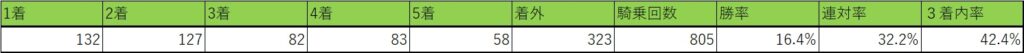 1着数、勝率、連対率、3着内率、騎乗回数をまとめています。