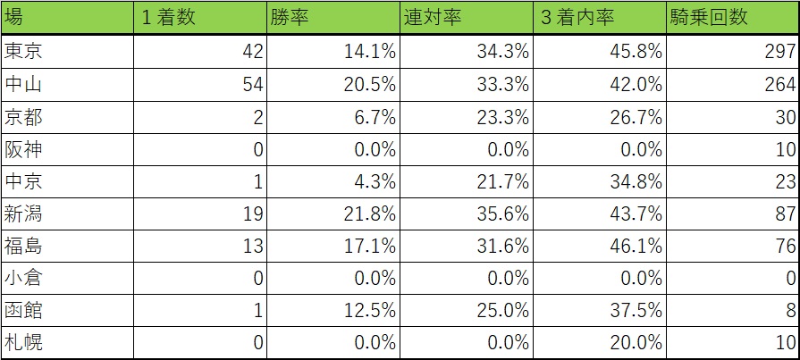 | 新潟芝1600 | 2 | 22.2% | 55.6% | 66.7% | 9 |