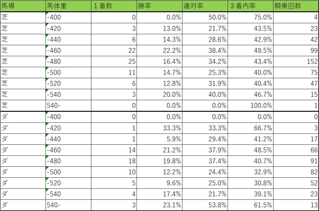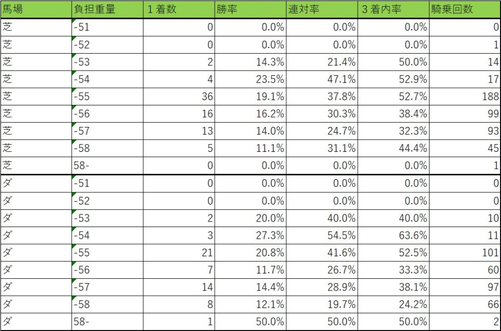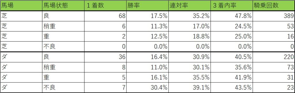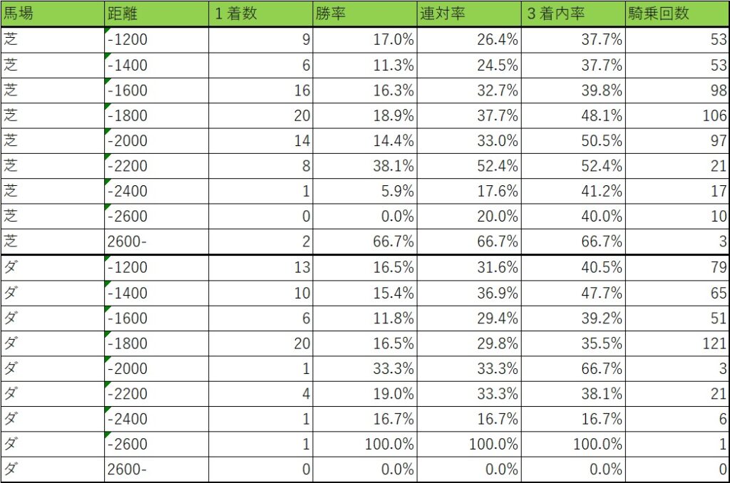 | コース・距離 | 1着数 | 勝率 | 連対率 | 3着内率 | 騎乗回数 |